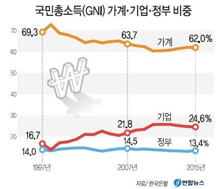 이 비율은 글로벌 금융위기가 터진 2008년 62.9%에서 2009년 62.4%로 떨어진 이후 7년째 60∼62%에 갇혀 있다. 과거에는 가계로 돌아가는 소득 비중이 이보다 훨씬 높았다. 연합뉴스