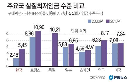 우리나라에 이어 미국이 2015년 110.4로 상승 폭이 두 번째였고, 독일(113.1), 프랑스(110.5), 덴마크(107.6), 이탈리아(107.4), 스페인(105.0) 등의 순이었다. 일본은 2015년 시간당 임금지수가 99.9로 오히려 5년 전에 비해 낮아진 것으로 분석됐다.