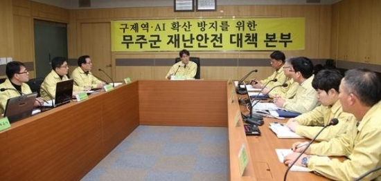 ▲ 무주군은 7일 AI·구제역 확산방지를 위한 재난안전대책 본부 회의를 열고 있다.