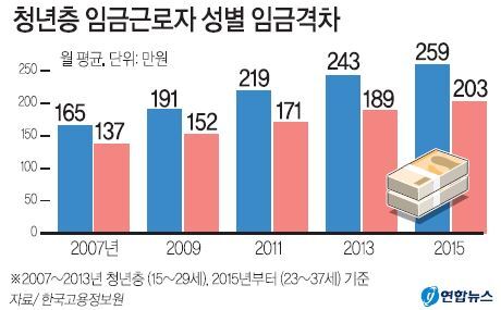 황 연구원은 한국고용정보원의 청년패널조사(2007∼2015년)를 이용해 청년층 임금근로자(상용·임시·일용직)의 월평균 임금을 분석한 결과, 남성은 2007년 165만원에서 2015년 259만원으로 8년 사이 56.9%(94만원) 증가했디.