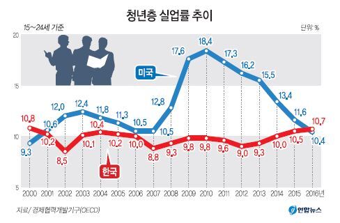 한국의 청년층 실업률 상승은 2013년부터 4년 연속 한 해도 거르지 않고 계속되면서 결국 지난해 미국을(10.4%) 앞질렀다. 연합뉴스