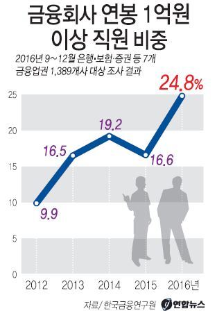 15일 한국금융연구원이 금융위원회에 제출한 ‘2016년 금융인력 기초통계분석’ 자료에 따르면 연봉이 1억원 이상인 금융회사 직원 비중은 24.8%였다.
