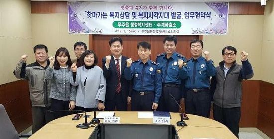 무주군 무주읍행정복지센터(읍장 박희영)와 주계파출소(소장 김수기)가 15일 복지사각지대 발굴·지원체계 구축을 위한 업무협약을 맺었다.
