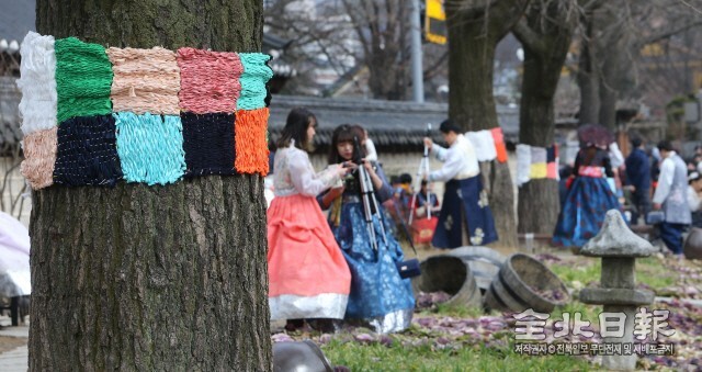 전주 핸드메이드시티 위크가 시작된 20일 재활용 원단을 사용해 만든 나무 옷을 입은 경기전 가로수 앞에서 관광객들이 기념촬영을 하고 있다.