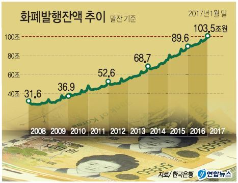 22일 한국은행에 따르면 지난달 말 현재 화폐발행잔액은 103조5100억원(말잔)으로 사상 최대를 기록했다.