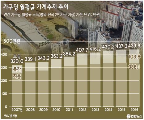 지난해 가구당 월평균 가계지출은 336만1000원으로 가구당 월평균 흑자액은 103만8000원이었다.