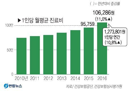 또 건강보험 가입자의 1인당 연간 진료비는 127만원으로 2015년에 비해 10.8% 증가했다. 노인진료비는 25조원을 넘어서며 전체 진료비에서 차지하는 비중이 40%에육박했다.