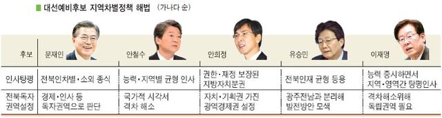 대선주자들도 전북의 이러한 정서를 알고 있다. 따라서 인사탕평과 전북균형지원을 강조했다. 그러나 지역차별해소법은 후보별로 차이를 보였다. 특히 전북독자권역 설정과 관련해서는 다른 지역과의 형평성 등을 의식, 일부 후보는 방향성만 제시했다.