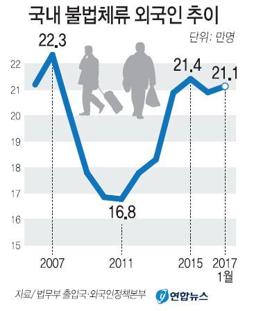 다만 국내 체류하는 외국인이 늘어나면서 불법 체류율(전체 외국인 중 불법체류자 비중)은 2012년 12.3%, 2013∼2014년 11.6%, 2015년 11.3%, 2016년 10.2%로 전반적으로 낮아지고 있다.