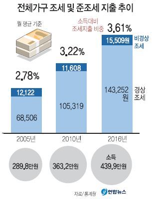 여기에 국민연금과 건강보험 등 준조세 부담까지 더하면 가뜩이나 어려운 가계형편이 더 팍팍해진 것으로 추정된다.