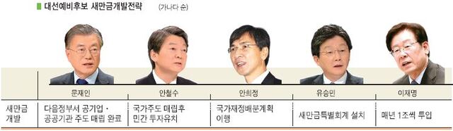 민주당 문재인 전 대표는 “대부분 매립이 민간매립이어서 지지부진하다. 매립은 공공기관·공기업이 주도하고, 다음 정권 기간에는 매립을 완료해 실제 가동을 통해 전북의 성장 동력으로 만들어야 한다”고 말했다. 그리고 이곳을 무인자율자동차와 무인항공기 시험 및 생산기지로 발전시켜야 한다고 제안했다.