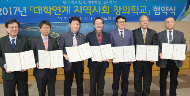 전북도는 지난 3일 도청 도지사접견실에서 송하진 도지사, 이남호 전북대·나의균 군산대·김응권 우석대·김도종 원광대·이호인 전주대·강희성 호원대 총장 등이 참석한 가운데 ‘2017년 대학 연계 지역사회 창의학교 협약’을 체결했다.