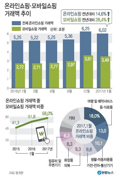 통계청이 6일 발표한 ‘2017년 1월 온라인쇼핑 동향’을 보면 온라인쇼핑 거래액은 6조192억원으로 1년 전보다 14.6% 증가했다. 연합뉴스