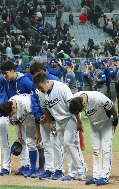 ▲ 지난 6일 밤 서울 구로구 고척스카이돔에서 열린 2017 월드베이스볼클래식(WBC) 개막전 대한민국과 이스라엘의 경기. 연장끝에 2-1로 패한 한국 선수들이 고개숙여 인사하고 있다. 연합뉴스