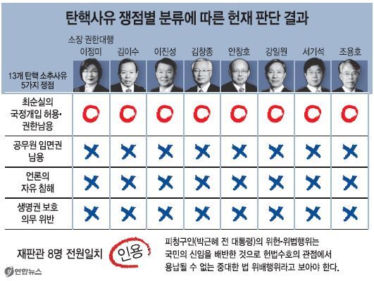 △최순실 국정개입 허용·권한남용 = 헌재는 박 전 대통령이 대의민주제 원리와 법치주의 정신을 훼손했으며, 국민의 신임을 배반한 것으로 ‘중대한 법 위배행위’가 있다고 결론지었다.