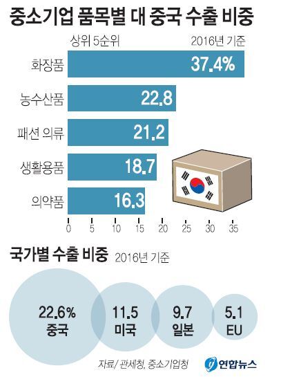 하지만 한류 영향으로 중국에서 인기를 끄는 일부 분야에서는 중소기업도 중국 의존도가 크게 높았다. 중소기업 품목별 수출 비중을 보면 패션 의류에서는 중국 수출 비중이 81.7%나 됐으며 화장품도 69.3%로 높았다. 연합뉴스