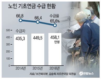 19일 보건복지부가 김승희 자유한국당 의원에게 제출한 자료에 따르면, 2016년 기초연금을 받은 노인은 전체 65세 이상 인구 698만7000명 가운데 458만1000명으로 수급률은 65.6%였다.
