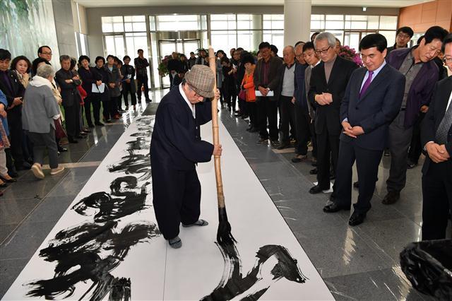 ▲ 20일 완주군 완주커뮤니티비즈니스센터가 개최한 지역리더 기부문화 확산 워크숍에서 서예가 이무호씨가 완주군 발전을 기원하는 서예 퍼포먼스를 하고 있다.