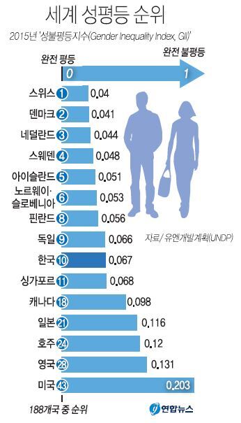 22일 여성정책연구원에 따르면 UNDP가 전날 발표한 한국의 GII는 0.067점으로 독일(0.066)에 이어 세계 10번째였다. 지난해 155개국 중 23위에서 13계단 올랐고 아시아에서는 순위가 가장 높다.