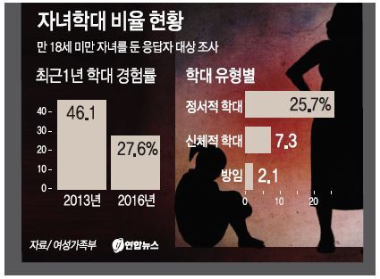 2013년 조사 때 46.1%에서 절반 가까운 수준으로 떨어졌지만, 여전히 자녀를 학대하는 부모가 네 명 중 한 명꼴이다. 자녀학대에는 신체적·정서적 학대는 물론 방임행위도 포함된다.