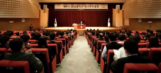 JB금융지주(회장 김한)는 지난 24일 JB금융지주 본사 3층 대강당에서 주주 및 회사 경영진 등이 참석한 가운데 제4기 정기주주총회를 개최했다고 26일 밝혔다. 주총에서는 정관 변경의 건, 이사 선임의 건, 감사위원이 되는 사외이사 선임의 건, 사외이사인 감사위원회 위원 선임의 건 등 총 7건의 안건이 상정돼 모두 원안대로 통과됐다.