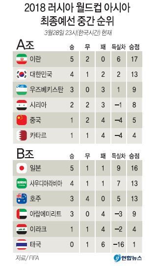 우즈베키스탄(4승3패·승점 12)이 조 3위를 지켰고 시리아(2승2무3패·승점 8)는 4위다.