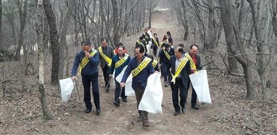 ▲ 고창군 대산면 주민자치위원회 위원 등이 29일 장자산에서 환경정화활동을 펼치고 있다.