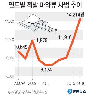외환위기 직후인 1999년 1만명을 처음 넘어선 마약류 사범 수는 2002년 당국의 대대적인 마약조직 소탕으로 7000명대로 줄었다.