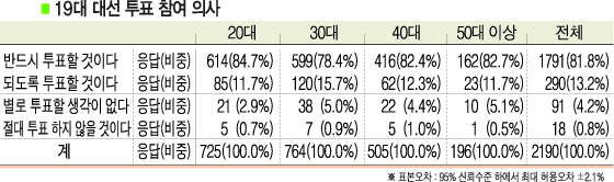 ‘되도록 투표할 것’이라는 응답도 13.2%로 나타나 응답자 대부분이 올 대선에 높은 관심을 보이는 것으로 나타났다.