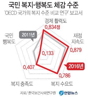 5일 한국보건사회연구원의 ‘OECD 국가의 복지 수준 비교 연구’ 보고서에 따르면한국의 복지 수준은 34개 경제협력개발기구(OECD) 회원국 중에서 2011년 23위에서 2016년 21위로 두 계단 올랐다. 이는 연구원이 ‘경제 활력’과 ‘복지 수요’, ‘재정 지속’, ‘복지 충족’, ‘국민 행복’ 등 5개 부문의 23개 지표로 각국의 복지수준을 측정한 결과다.