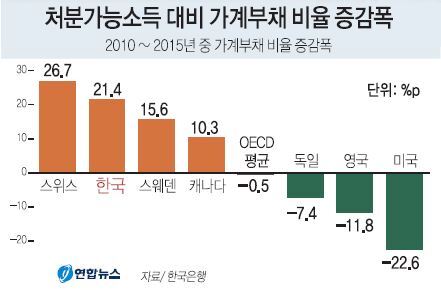 한은이 2015년 말 자금순환통계 기준으로 OECD 회원국(35개국) 중 25개국의 처분가능소득 대비 가계부채 비율을 분석한 결과, 한국은 169.0%로 평균(129.2%)보다 39.8% 포인트(p) 높았다. 연합뉴스