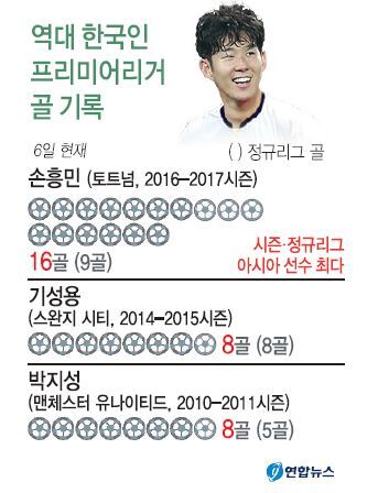종전에는 손흥민 외에 기성용(스완지시티)이 2014-2015시즌에 8골을 넣은 바 있다.