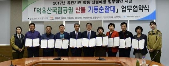 덕유산국립공원사무소(소장 허영범)가 공원과 접경구역에 있는 무주와 장수, 경남 거창과 함양군 등 4개 지역 우체국 및 개인택시협회와 함께 ‘덕유산 산불 기동순찰대’ 활동 업무협약을 맺었다.