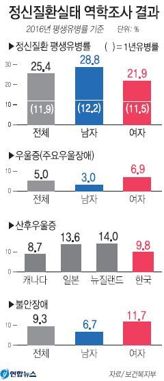 12일 보건복지부의 ‘2016년도 정신질환실태 역학조사’ 자료에 따르면 우리나라 18∼29세(이후 20대로 칭함) 남자의 ‘주요 우울장애’(우울증) 일년유병률은 2011년 2.4%에서 2016년 3.1%로 증가했다. 연합뉴스