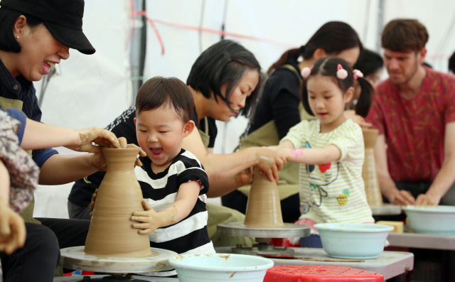 ▲ 문경찻사발축제에서 어린이들에게 인기를 끌고 있는 찻사발 빚기 체험. 가족단위 체험객들이 찻사발을 빚으며 즐거워하고 있다. 사진 제공=경북 문경군