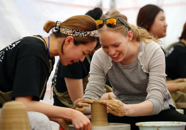 ▲ 문경찻사발축제 참가한 외국인들도 도자기를 빚기 체험을 하며 즐거워하고 있다. 사진 제공=경북 문경군