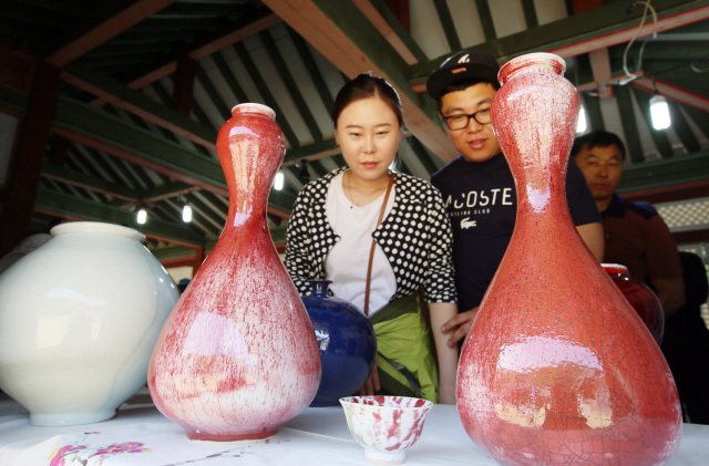 ▲ 축제를 찾은 방문객들이 유명 도예명장들의 작품을 흥미로운 시선으로 감상하고 있다. 사진 제공=경북 문경군