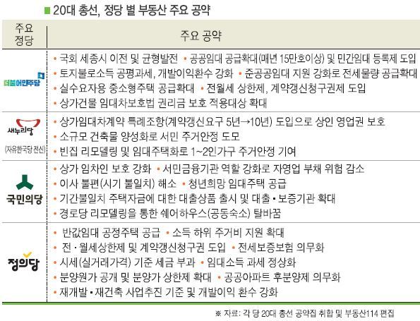 지난 20대 총선에서 주요 정당이 내세웠던 부동산 관련 공약 대부분은 주거복지 강화에 정책 방점을 뒀다.