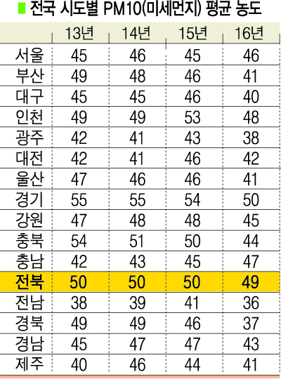 실제로 전북은 경기·충북과 함께 2013~2015년 3년 연속 대기환경 기준(연평균치 : 50㎍/㎥)을 넘어선 3개 지역에 포함되는 등 미세먼지로 인한 피해가 심각한 지역으로 꼽히고 있다.