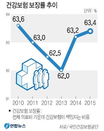 20일 국민건강보험공단이 발표한 ‘건강보험환자 진료비 실태조사’에 따르면 2015년 건강보험 보장률은 63.4%로 전년(63.2%)보다 0.2%포인트 상승한 것으로 나타났다.