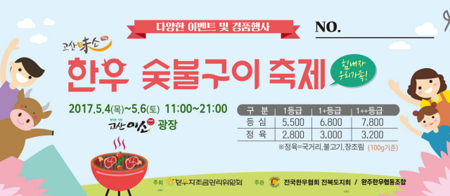 전국한우협회전북도지회와 완주군한우협동조합이 마련한 한우 숯불구이축제가 4일부터 6일까지 완주 고산미소시장 광장에서 열린다.