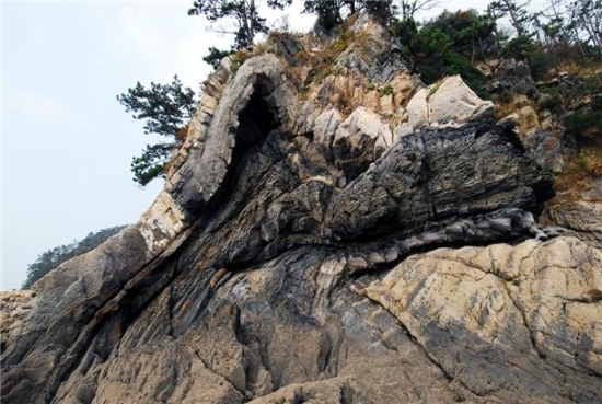 ▲ 천연 기념물 501호로 지정된 옥도면 말도 습곡구조지질의 암벽.