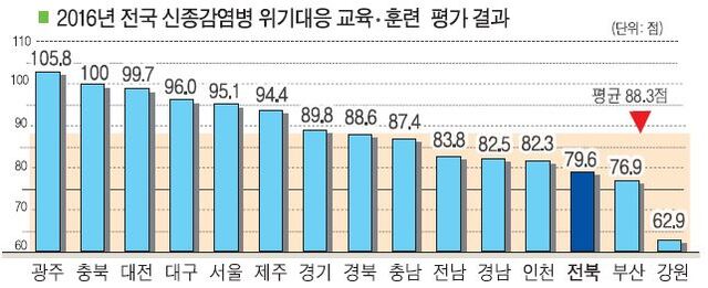 질병관리본부의 ‘2016년 신종감염병 위기대응 교육·훈련 결과 및 만족도 평가’결과를 보면, 전북과 부산·강원 등 전국 7개 시도가 110점 만점에 평균(88.3점) 미만의 점수를 받았다. 지난해 신종감염병 위기대응 평가는 사전 준비와 전문가 강의, 훈련 내용, 조별참여 등의 항목으로 구성됐다. 주된 평가 내용은 감염예방 수칙과 메르스 대응체계, 의심환자 판별 등이다.
