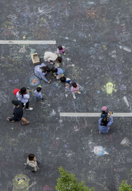 ▲ 광주 동구 금남로 일대에서 열린 프린지페스티벌 2017. 어린이들과 어른들이 금남로 거리에 분필을 이용해 그림을 그리고 있다. 광주일보=김진수 기자