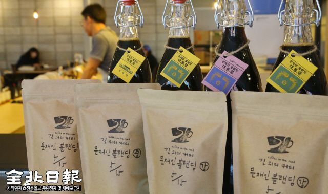 ▲ 전주 금암동에 위치한 카페 ‘길 위의 커피’에 최근 최윤진 대표가 선보인 ‘문재인 커피’가 진열돼 있다. 박형민 기자