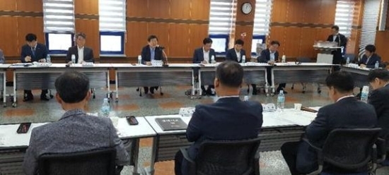 ▲ 진홍 전북도 정무부지사와 도내 43개 경제단체 기관장들이 18일 한국자산관리공사 전북본부 회의실에서 ‘기관별 지역경제 활성화를 위한 업무협조 및 협업과제’에 대해 토론을 하고 있다. 사진제공=전북도