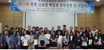 지난 20일 전북대 인문관에서 열린 대회에는 도내 32개교 513명이 참여해 ‘점(點)’(운문)과 ‘선(線)’(산문)을 주제로 작품을 썼다. 100만 원 상당의 도서상품권이 주어지는 우수 학교상은 원광여고와 전북여고가 차지했다.