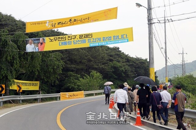 본산산단에서 봉하마을까지 거리는 1km 남짓. 봉하로 초입부터 ‘5월 다시 희망입니다’, ‘보고 계시나요? 다시 사람 사는 세상으로’, ‘노무현의 친구 문재인 대통령 당선을 뜨겁게 환영합니다’라는 내용이 적힌 현수막이 곳곳에 걸려 있었다.