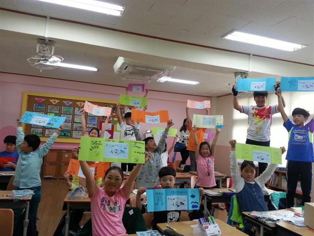 ▲ 군산시 ‘어린이 군산학’ 수업을 받은 학생들이 교육 결과물을 들어 보이며 환하게 웃고 있다.