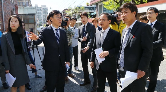 ▲ 지난달 27일 전주지법 군산지원 재판부와 검사, 변호인 등 관계자들이 17년 전 발생한 익산 약촌오거리 택시기사 살인사건에 대한 현장 검증을 하고 있다. 박형민 기자